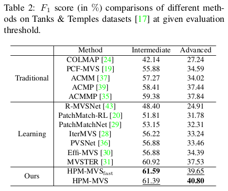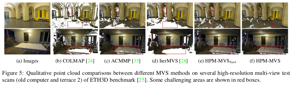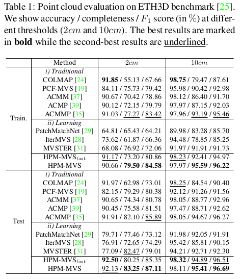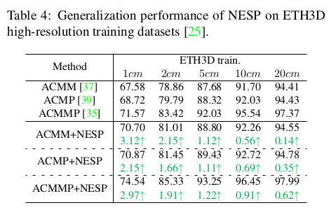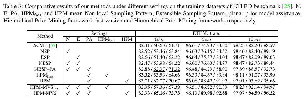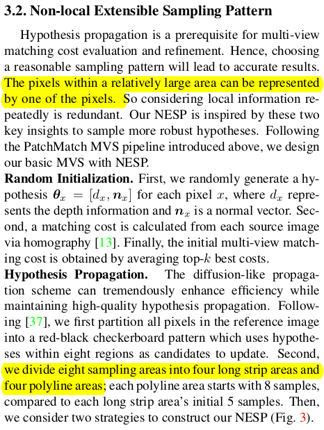 | 전체 파이프라인은 위 그림과 같다. coarse-to-fine이 일반적인 것 같지만 여기선 fine-to-coarse-to-fine, fine-to-medium-to-fine 과 같이 반대방향으로 내려갔다 다시 올라오는 방식을 취한다. coarse scale로 내려갔다오면서 planar prior 정보를 가져오는 식이다. (plane은 coarse scale에서 찾을 때 효율이 좋으니) 핵심은 그림에 NESP라고 표시되어 있는 non-local extensible sampling pattern과 ACMP 방식에서 조금 더 나아간 planar prior 사용 방식이다. |