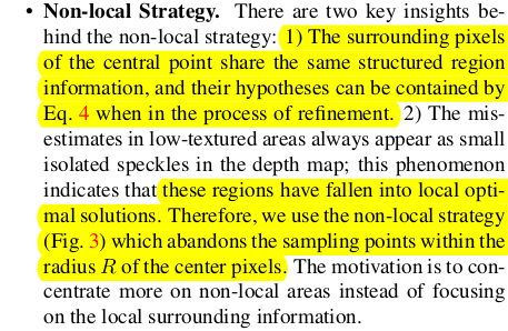 핵심 아이디어는 patchmatch stereo pipeline을 그대로 가져가되 neighbor를 정의하는 방식을 좀 더 dynamic하게 변경해서 좁게 보아야 할 때는 좁게, 멀리 보아야 할 때는 멀리 볼 수 있도록 했다. 이렇게 변경함으로써 얻는 장점은, 정적으로 neighbor를 정의할 경우, 멀리까지 탐색해야 할 때도 근처에서 탐색하면 local minima에 빠질 위험이 늘어나는데 동적으로 탐색하기 때문에 이런 문제가 완화된다. 또한 ACMP에서 최종 1번만 수행했던 planar prior assistance를 multi scale에 적용함으로써 더 강하게 포함시켰다.