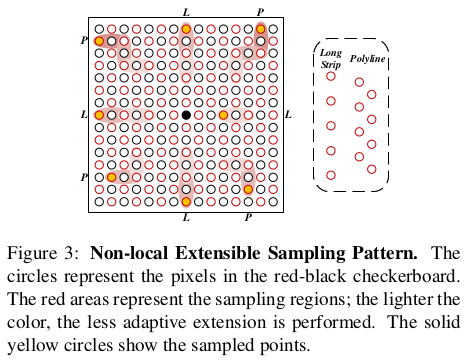 먼저 NESP는 cost function을 정의할 때 사용하는 neighbor의 탐색 범위를 재정의한 것이다. 초창기에는 sequential, 이후에는 diffusion-like 방식으로 변해 다양한 디자인의 윈도우를 사용했었는데 공통점은 정적이라는 것이다. 디자인에 따라 특성이 고정되는 방식이었는데, NESP는 탐색 반경을 정하는 것까지는 정적으로 하되 그 반경 안에서 sampling을 하는 단계는 동적으로 설정해서 조금 더 adaptive하게 neighbor를 정의할 수 있도록 했다. ![]() 위 그림의 패턴처럼 십자가 모양으로 4 영역, 대각선 지그재그 모양으로 퍼지는 4영역까지만 정적으로 정해두고 그 안에서 sampling은 동적으로 했다. |