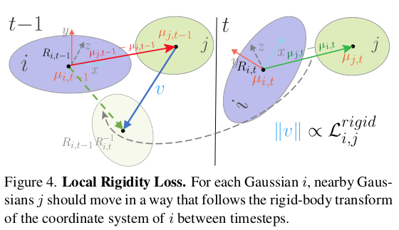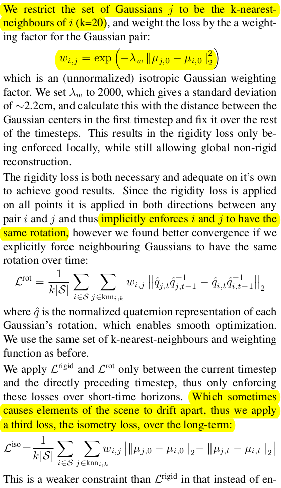 추가적으로 rigidity를 보조하기 위해서 rotation만, translation만 비슷하도록 강제하는 loss가 각각 추가된다. 먼저 rotation은 간단하다. (neighbor의 다음, neighbor의 현재 ) - (대상의 현재, 대상의 다음) 간 차이가 없도록 했다. 대상 3d gaussian의 rotation 변화량과, neighbor 3d gaussian의 rotation 변화량이 같도록 강제한다. 그 다음 translation은 더 간단하다. 첫 프레임에서 neighbor 간 거리가 매 시점마다 계속 비슷하게 유지되도록 강제했다. 즉 첫 프레임 복원 결과를 끝까지 유지할 수 있도록 강제하는 것이다. 각각은 neighbor 간 거리가 가깝고 멂에 따라 가중치가 곱해진다. |