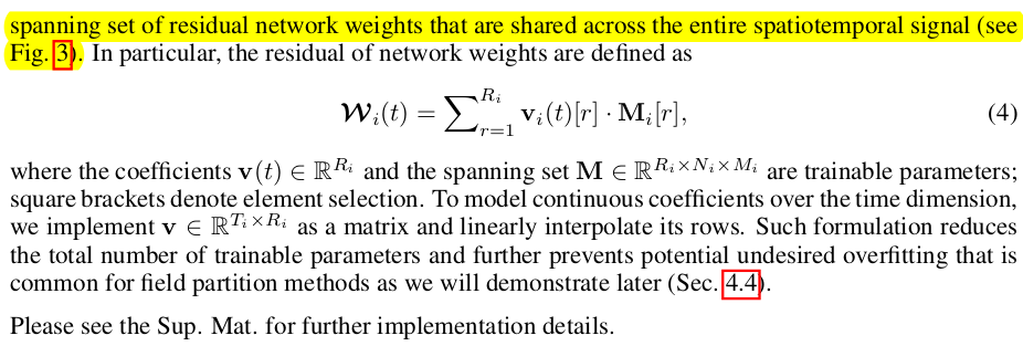 사실 전체 논문 내용은 옆의 그림 한 장으로 끝난다. 각 MLP 내부 weight에 time stamp 별로 더해질 residual을 따로 만들어둔다는 내용이다. MLP + n * W * t 개 파라미터로 늘어나지만 weight를 바꿔치기 하는 방식이라 속도 저하가 없다. |