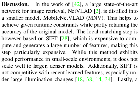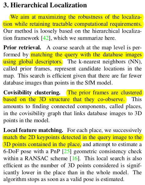 핵심 내용은, 1) global descriptor를 이용한 image retrieval로 대충 영역 줄이기, 2) retrieved images로 3D matching 대상 point추리기 3) feature matching + PnP w/ RANSAC으로 localization하기다. 동시에 1)2)3) 과정을 실시간으로 하기 위해서 빠르게 global descriptor, local feature를 뽑아내는 네트워크를 같이 제안했다.