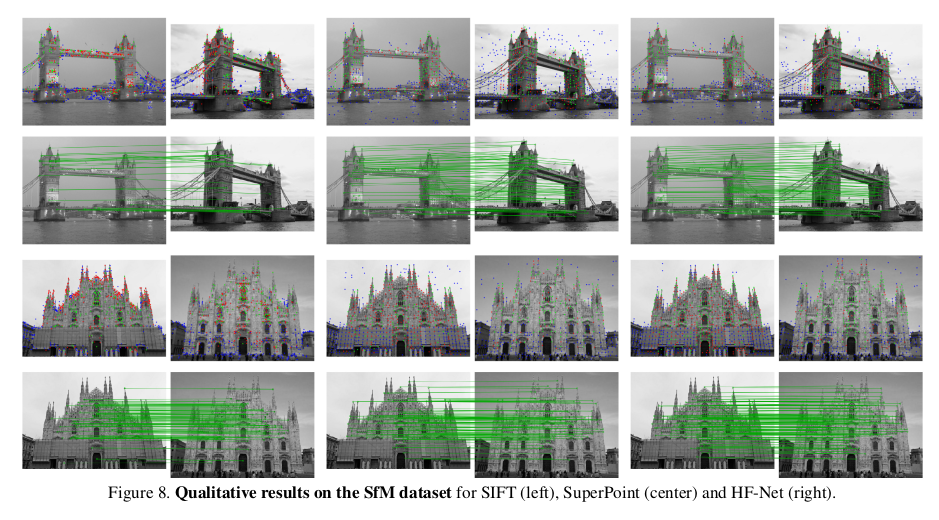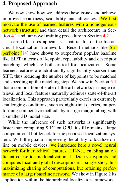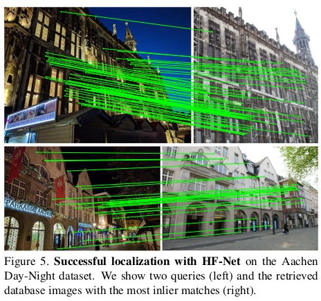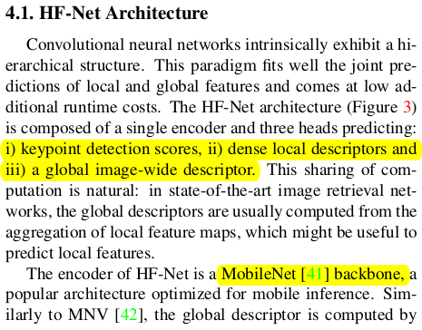 이 과정에서 global descriptor와 local feature가 매번 필요한데 이를 기존 SOTA 알고리즘들(이 당시 NetVLAD, SuperPoint)을 가져다 쓸 수도 있지만 각각이 무겁다보니 이를 실시간으로 쓰기 위해선 경량화할 필요가 있었고, 거의 성능 저하없이 global descriptor, local feature를 같이 뽑아주는 가벼운 HFNet이라는 네트워크를 디자인해서 사용했다. --- 실시간이 아니라면 SOTA 그대로 쓸 수도 있다! 실제로 hloc github에 그렇게 구현되어 있음. |