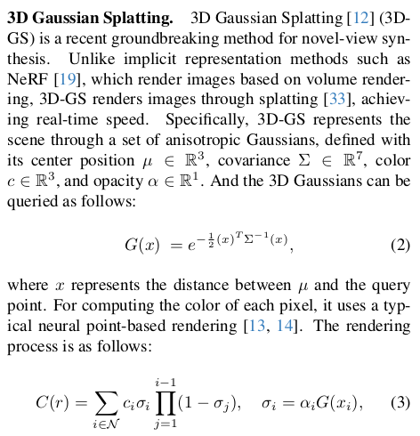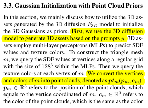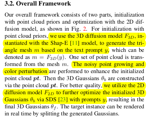 과정은 다음과 같다. 1) 3d diffusion model mesh 얻기 2) mesh to point cloud 3) point cloud pertubation 4) 3d gaussian initialize 5) update 3d gs using 2d diffusion w/ SDS loss 각각은 novelty가 없다. 파이프라인으로 이어붙인 것이 의미. |