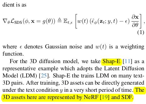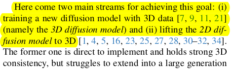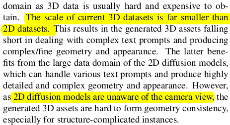 2D, 3D diffusion model을 둘 다 붙이려는 이유를 다음과 같이 설명한다. 1) 3d diffusion은 3d consistent 생성 성능은 좋지만 데이터 부족으로 인해 생성 범위가 좁음 2) 2d diffusion은 생성 범위는 넓지만 camera view를 고려하지 않으므로 3d consistency가 부족함 따라서 상호보완적이므로 둘 다 prior로 쓰는 것이 좋다는 주장이다. |