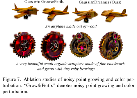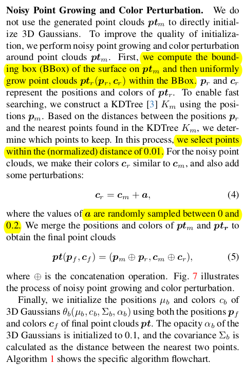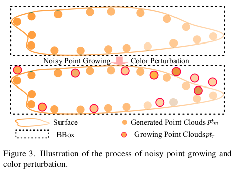 ![]() 3d diffusion model이 아직까지는 데이터 부족의 문제로 넓은 생성 범위를 갖지 못하므로 point cloud 개수가 부족하거나, 색상이 단조로운 단점이 있다. 너무 단조로운 값으로 초기화를 하는게 맘에 걸렸는지 position과 color에 pertubation을 가해주는 식으로 약간 augmentation을 해주었다고 한다. (실제로 단조로운 초기화값으로도 문제가 없었을텐데... 초기화가 얼마나 영향을 주는지에 대한 ablation이 뒤에 사진 한 장있지만 도움이 되는지는 잘 모르겠다. ) |