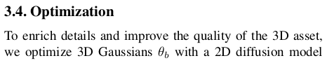이 논문도 text-to-3D를 타겟으로 하는 논문인데, novelty가 있다기 보다 어떻게 2D, 3D diffusion model과 3D GS를 엮었는지 보여주는 테크니컬 리포트에 가깝다. 물리적으로 찾아낸 SfM 결과에서 시작한 것이 아니라 generation 모델로 얻어낸 결과에서 시작하는 컨셉을 보여주는 논문이다. 큰 틀에서는 이전에 봤던 DreamGaussian 과 동일하다고 볼 수 있다.