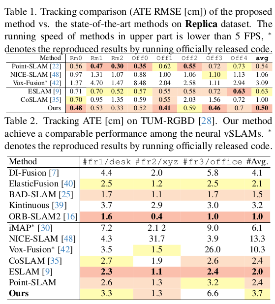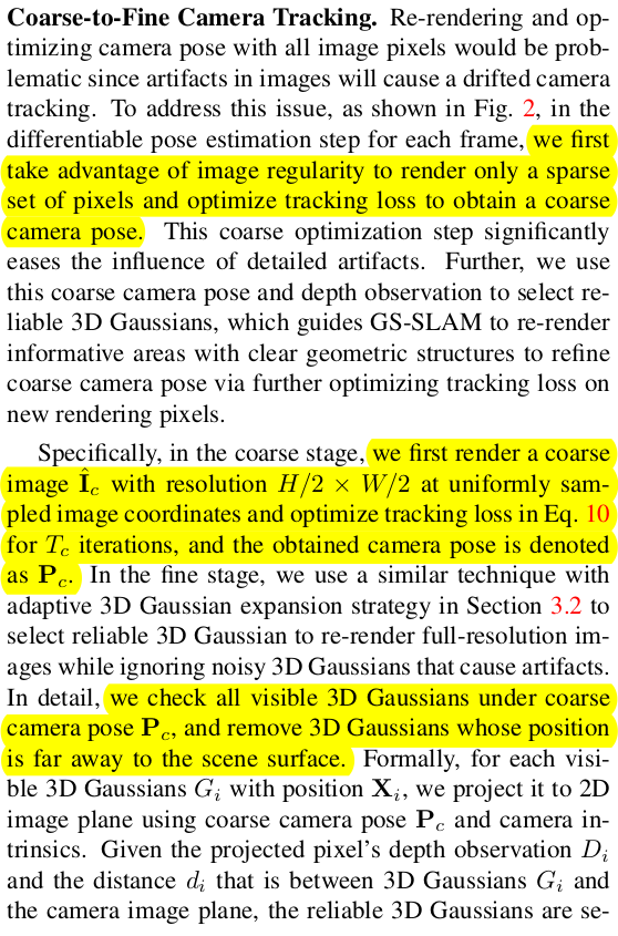 보다 안정적인 카메라 포즈 추정을 위해서 추정 과정에 사용할 gaussian 선별에 조금 힘쓴 느낌이다. 먼저 coarse scale로 이미지를 H/2, W/2로 렌더링을 먼저 해본다음 1) 이 때 사용된 gaussian 중 2) surface와 가깝게 있는 gaussian만 사용했다. 저해상도일 때 굵직굵직하게 기여하는 gaussian만 사용하고 그마저도 surface 근처있는 애들만 쓰겠다는 컨셉이다. 이렇게 선별된 gaussian만 가지고 원래 해상도로 이미지 렌더링해서 loss를 먹인다. |