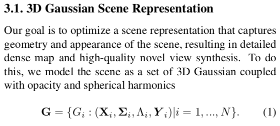 3d gaussian recap에 가깝다. 3D GS 논문에서는 카메라 포즈에 대한 notation이 W로 적혀있었지만 여기선 더 직관적으로 P=[R|t] 라고 적었을 뿐이다. P.Inv로 적힌 이유는 P가 camera-to-global 방향이기 때문. ---- 추가적으로 gaussian을 갖고 depth를 렌더링하는 컨셉을 수식(5)와 같이 사용했다. gaussian 중점 위치를 opacity에 따라 적분한 값인데 왠지 살짝 불안한 느낌이 든다. 불투명한 영역의 gaussian이 실제로 opacity 1을 갖는지, gaussian이 실제 물리적 geometry랑 맞아떨어지게 생성되는지 확인이 안된 상태이기 때문에 약간 불안한 것 같다. 그래서 인지 SLAM 대상 공간을 갇힌 방으로 한 것 같기도...? |