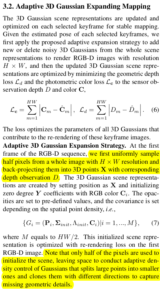 학습에 사용하는 loss는 rendered color, rendered depth를 이용한 L1 loss다. RGBD 입력을 갖고 있으니 두 가지 supervision이 가능하기 때문이다. ----------- 학습 과정은 depth가 있기 때문에 3d gaussian의 초기화도 더 쉽고, 유효성을 판단하기도 더 쉬워졌다. 예를 들어, 그냥 backprojection해서 초기 위치 잡아주기도 쉽고, 생성될 때 depth point에서 멀어지면 지워버릴 수 있기 때문이다. ---------- 초기화는 앞서 예를 든 것과 같이 RGBD w/ intrinsic이니 back projection해서 얻는다. 다만 너무 촘촘하게 back projection될테니 H/2, W/2 총 1/4 pixel만 back projection 한다. 논문에서는 새로 생성될 공간을 두기 위해서 그랬다는데 굳이 안그래도 됐을 것 같다. 뒤에 제거하는 logic이 잘 동작한다면 알아서 없앨 것이기 때문이다. |