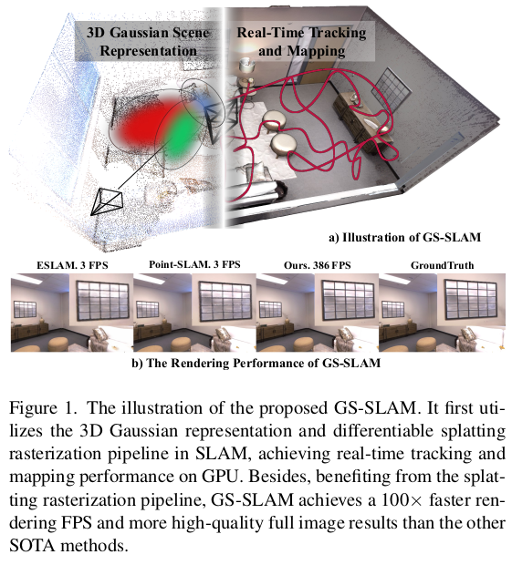 이 논문은 제목에서 짐작할 수 있다시피 3D gaussian과 SLAM을 엮은 것이다. 기존 SLAM이 camera pose랑 scene point cloud를 동시에 획득해나가는 과정이었다면 camera pose와 scene gaussian을 동시에 획득해나가는 과정을 담았다. 하나 아쉬운 점은 제목만 봐서는 Visual SLAM이니 RGB 이미지만 쓰는 것 같지만 까보면 RGB-D SLAM이다. 센서에서 들어오는 Depth 정보를 전적으로 신뢰하면서 이런저런 보정을 해나가는 방식이라 기대에는 살짝 못미치는 내용이었던 것 같다.