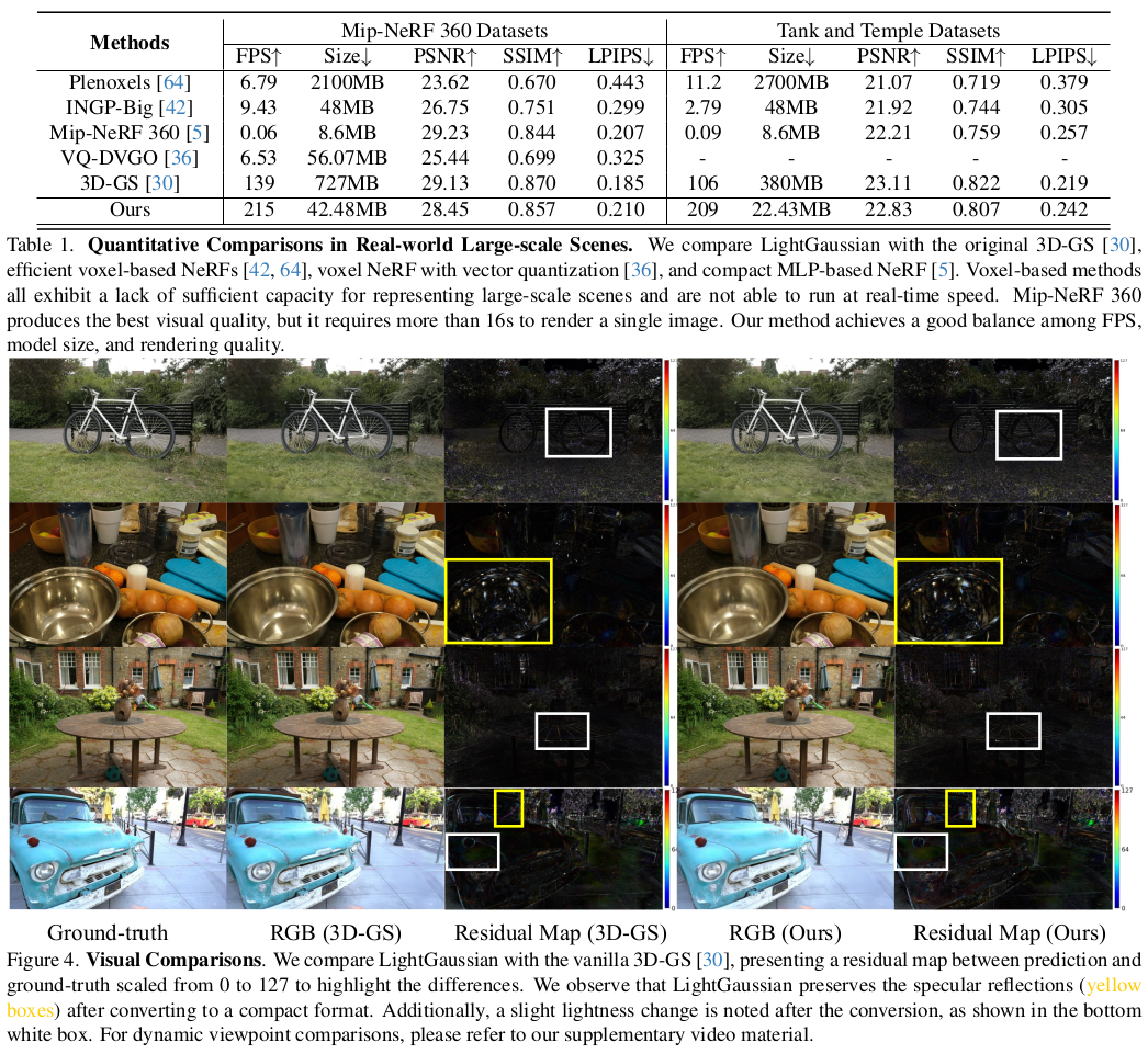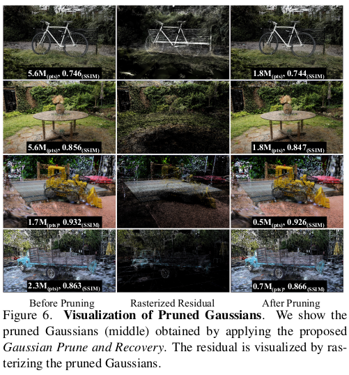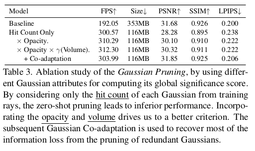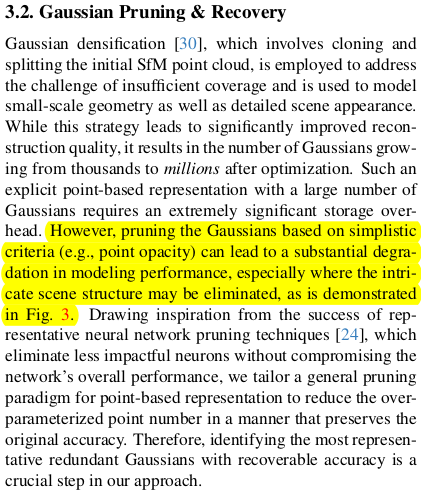 또 하나의 3D GS 후속 연구 중 한걸음 나아간 논문이 나왔다. 제목에서 볼 수 있다시피, 기존 3D GS 대비 성능 드랍 없이 속도를 훨씬 빠르게 한 논문이다. 핵심 아이디어는 1) gaussian pruning (filtering) logic을 추가해서 절대적으로 3D GS 수를 줄인 것 (내가 하고 싶었던 것이다.) 2) gaussian parameter를 quantize해서 용량 자체를 물리적으로 줄인 것. 이 두 개를 조합하니 성능은 오르고 속도는 빨라지는 결과를 얻을 수 있었다.