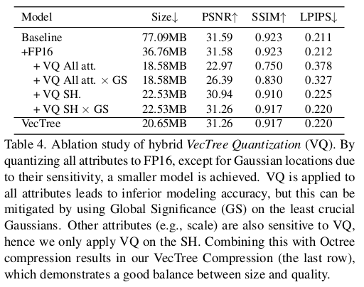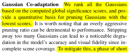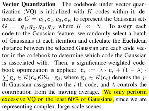 크게 3가지 과정으로 구성된다. 1) gaussian pruning - multiview scoring을 이용해 제거하기 2) SH distillation - high degree SH랑 비슷한 성능을 내는 low degree SH coefficient 찾기 - 학습 완료한 후에 후처리로 하는 것 3) SH 외 나머지는 quantization 기법 적용하기 - 중요한 GS를 quantization하면 성능이 떨어지니, 하위 60%만 quantization! |