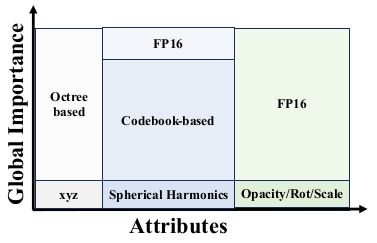 여긴 사실 잘 이해 못했다. 1) global score를 가져와서 3D GS를 sorting한다. 상위 40%는 그대로 두고 하위 60%만 quantization 대상으로 선정한다. ![]() 상위 40%는 아무것도 건드리지 않고 그대로 저장하는 방식이고 나머지는 각각 적합한 방식으로 quantization 된다. 1) xyz position, octree based quantization global score가 높은 GS 위치를 기준으로 octree를 만들어가는 식으로 위치를 저장함 2) SH code-book을 만들어서 SH coefficient를 더 적은 값으로 표현할 수 있게 함. 3) opacity, rotation, scale은 fp16으로만 |
