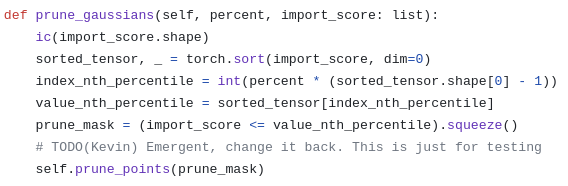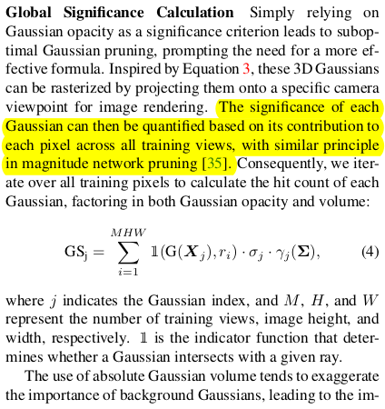 GS마다 렌더링에 얼마나 기여하는지 그 score를 먼저 정의를 해야하는데 총 3가지를 보았다. 1) 렌더링에 참여하는 횟수 2) GS 자체의 opacity 3) GS 자체의 크기 다 클수록 유의미한 GS로 보기에 적합한 metric인 것 같다. 1) 2) 3)을 곱하는 형식으로 global score를 정의했다. ** opacity 0인 애들이 pruning되기 쉬운 것은 여전히 맞다. 하지만 렌더링에 참여하는 횟수가 많다면 그리고 크기가 크다면 살아남을 가능성을 높여주므로 이전보다는 낫다. 여기서 3) GS 자체의 크기를 정의할 때, 단순히 scale 값을 사용할 수도 있겠지만 절대적인 값으로 할 경우, 복원 대상이 클 때와 작을 때 범용적으로 적용될 수 없으므로 normalized volume을 사용했다. 현 상태의 GS 중 상위 10% 정도 위치에 있는 크기를 기준으로 normalization 한뒤 ,0~1로 clipping해서 사용했다. 이러면 상대적으로 큰 애들이 score가 높으므로 복원 대상이 물리적으로 얼마나 크냐 작냐는 중요하지 않게 된다. |