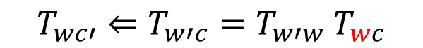 구체적으로 더 설명해보면, 아래 camera pose, T_wc 가 주어졌다. 2)에 의해 world coord.에서 바라본 camera pose, c가 된다.