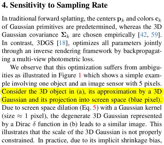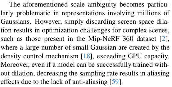 근데 scalar parameter가 의미없는 gaussian을 줄이는데는 기여를 조금 할지 모르겠지만 성능 저하의 원인이기도 하다고 지적한다.![]() 왼쪽 그림(a)처럼 3d gaussian 크기가 충분해서 픽셀보다 작거나 몇 픽셀 안되는 크기로 projection되는 것을 걱정할 필요가 없을때는 dilation parameter를 통해 픽셀 단위로 크기를 보장하는 것이 큰 무리는 없다. 하지만 만약 3d gaussian이 너무 작아서 픽셀보다 작은 크기로 projection 됐을 경우에는 dilation을 통해 픽셀 전체로 확장시켜 버리는 것이 물리적으로 맞아떨어지지 않기 때문에 성능에 좋은 영향을 주진 못한다고 말한다. |