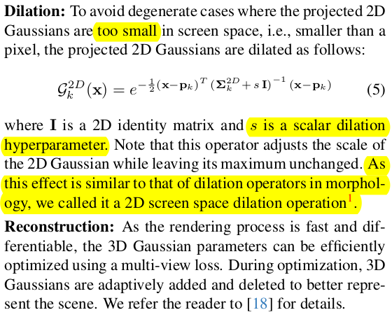3D GS recap이 주된 내용인데 dilation은 한 번 짚고 넘어가야 한다. 이 부분이 논문에서 문제로 지적하는 원인이기 때문. dilation이라는 용어는 이 논문의 저자들이 새로 붙인 것이라서 그냥 받아들이면 되고 의미만 이해해보면 3D to 2D projection했을 때 gaussian이 너무 작을 경우에는 의미가 전혀 없으므로 약간의 최소 크기를 보장하기 위해 scalar dilation hyperparmaeter를 더해준다. 극단적으로 projection했더니 2D gaussian이 만약 이미지 픽셀 보다 작을 경우, 이미지 픽셀 크기나 그것보다 조금 더 큰 크기로 보정해주는 기능이라고 보면 된다. 이렇게 하면 생성된 gaussian 들이 그래도 최소 크기를 가진다. |