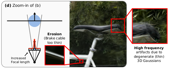 반대로 2) zoom out(focal length 작아질 경우)가 확 커질 경우![]() 원래 1픽셀보다 크게 projection 돼서 dilation 영향 거의 안 받던 3D gaussian도 1픽셀 이하로 projection될 가능성이 생긴다. 이러면 3d gaussian이 엄청 작을때랑 똑같은 문제를 겪게 된다. blur되고 더 밝게 나오고 등등. |