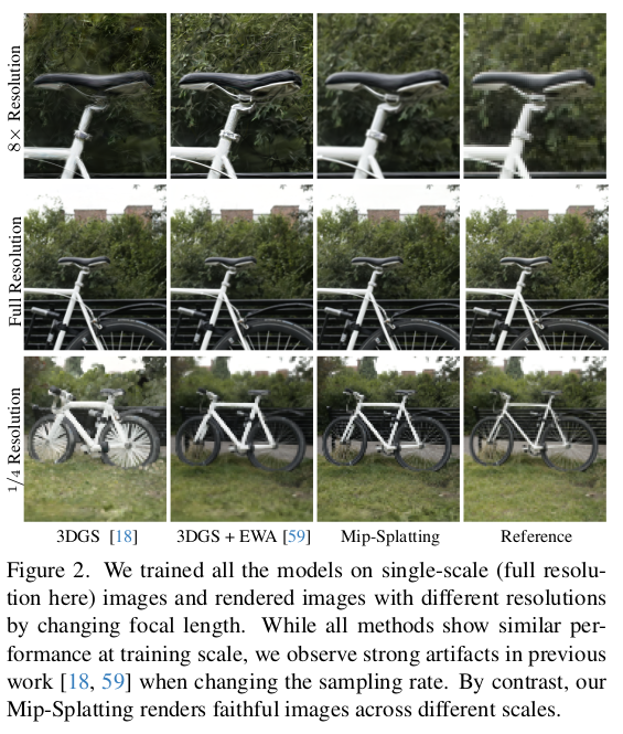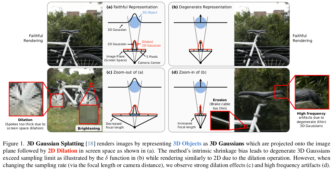 또 중요한 의미를 갖는 3D GS 파생 연구가 나온 것 같다. Mip-NeRF와 같이 aliasing 문제를 풀어서 성능을 끌어올리는 컨셉의 gaussian splatting 논문이다. 현재 3D GS 기술을 분석하길 3D to 2D gaussian projection 이후에 픽셀 해상도 단위로 discretize해서 사용하는 부분에서 성능 저하 여지가 많다고 지적한다. 이러한 문제는 학습할 때와 다른 focal length, 다른 카메라 거리일 때 두드러지는 현상과 일맥상통한다.