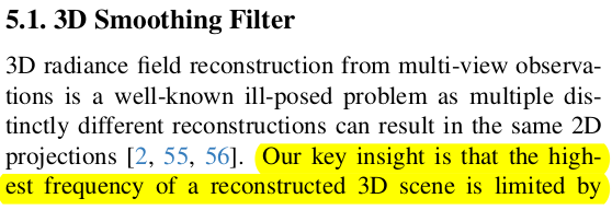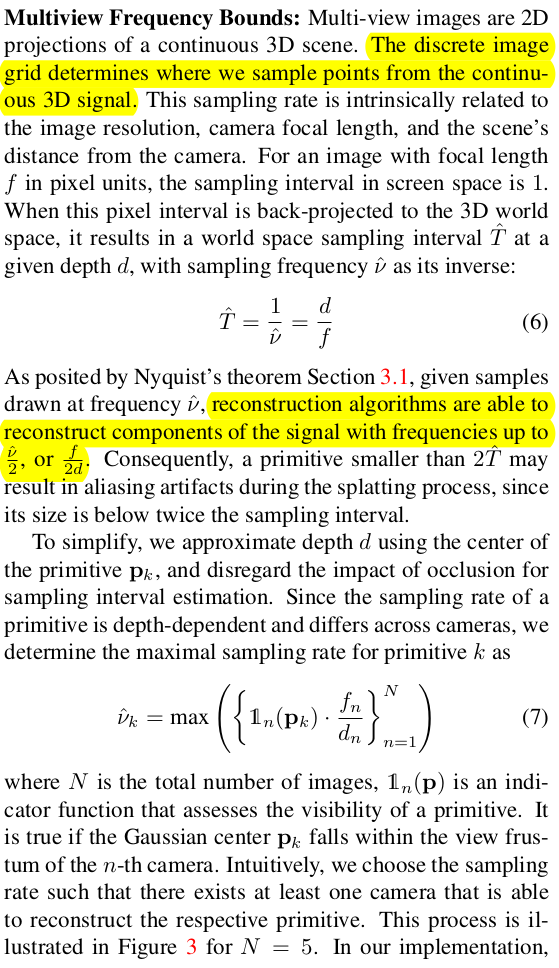 첫번째로 이 논문을 이해하기 위해 깔고 가야하는 이론적 배경이 1개 있다. sampling에 관한 것인데 "continuous signal을 aliasing 없이 discrete signal의 조합으로 잘 표현하기 위한 조건" 으로 이해하면 된다. 1) continuous signal이 특정 범위 안으로 한정될 것. 2) sampling rate가 continuous signal 최고 frequency의 최소 2배는 넘을 것 ------- 이 말이 지금 3d gaussian 하고 이미지 관계를 푸는 것과 무슨 상관이 있나 싶을텐데, 간단히 말하면 continuous signal을 3d gaussian의 크기, sampling rate는 이미지의 해상도 라고 볼 수 있다. 대충 주어진 해상도의 이미지를 만들어내기 위한 3d gaussian의 최대 크기 를 찾아낼 때 참고할 이론이다. 직접 쓰이지 않는다. 컨셉만 가져온다. |