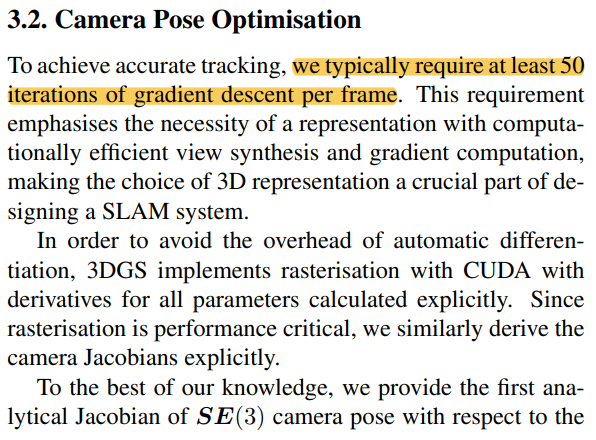 핵심 내용도 똑같이 카메라 포즈와 3d gaussian과 같이 학습시키는 방법이다. 카메라 포즈에 대한 jacobian을 직접 수식 계산했다는 점엔서는 GS-SLAM이랑 비슷하지만 큰 틀에서는 그냥 3d gaussian splatting을 SLAM에 갖다 붙이기 때문에 큰 차이 없다.