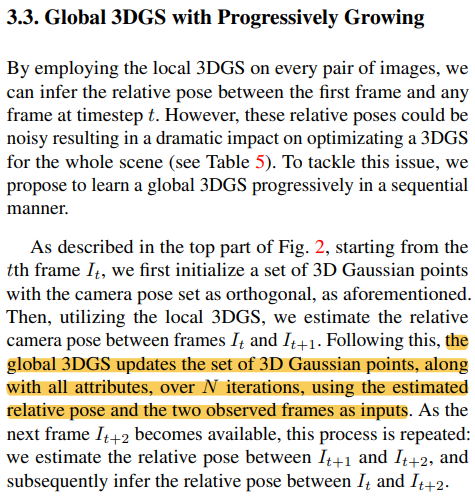1) t-1, t 두 프레임 간의 gaussian을 최적화해서 초기값을 계속 잡아주는 local 3d gs 2) ~~ t frame 까지의 gaussian과 카메라 포즈를 전체 업데이트하는 global 3d gs로 나뉜다. |