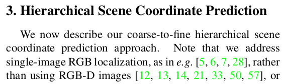 2020년 논문이긴 하지만 많이 옛날 논문 느낌이라 기록만 하고 넘어간다. 핵심 아이디어는 CNN 기반으로 scene coordinate regression하면 이미지 전체보다 패치 단위로 할 때 잘된다는 결과가 있는데, 이를 coarse-to-fine으로 이어 붙여 이미지 전체에서도 잘되기 만든 것이다. 이론적 내용, loss 설계보다 파이프라인이 더 중요한 논문이라 내용 자체는 아주 간단함.