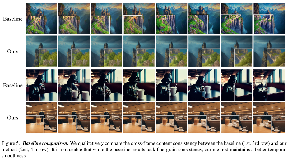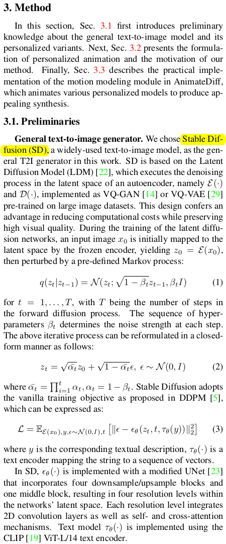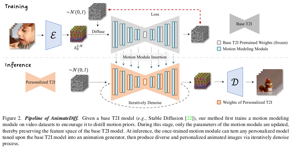 SD는 처음부터 끝까지 freeze된 상태이며, motion module만 업데이트 된다. motion module은 대상마다 같은 task 별 tuning을 반복하는 문제를 해결하기 위해 제안된 것인 만큼 여러 대상이 같은 task에 대해선 공유할 수 있다. 즉, motion 만드는 task로 학습을 시켜두면 대상(prompt)이 바뀌어도 그대로 동작한다. |