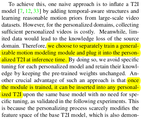 fine tuning의 정석 dreambooth와 LoRA를 다시 recap함. 특히 motion module은 거대 LoRA 같은 느낌이어서 강조하는 것 같다. |