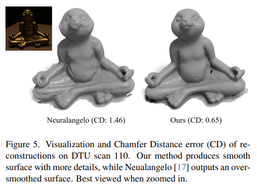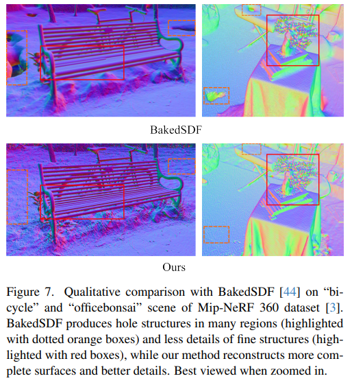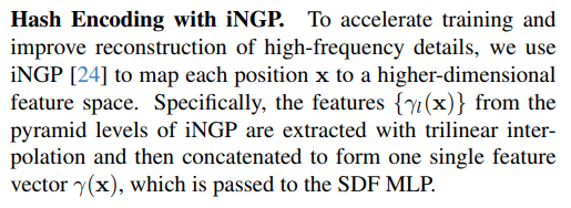 | 그외 기본적인 내용은 VolSDF를 차용함과 동시에 mip-nerf360과 같이 압축 공간을 사용했다는 점. | instant NGP 구조를 차용했다는 점은 특별한 것 없다. |