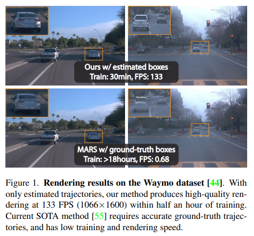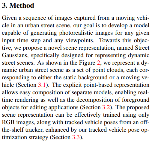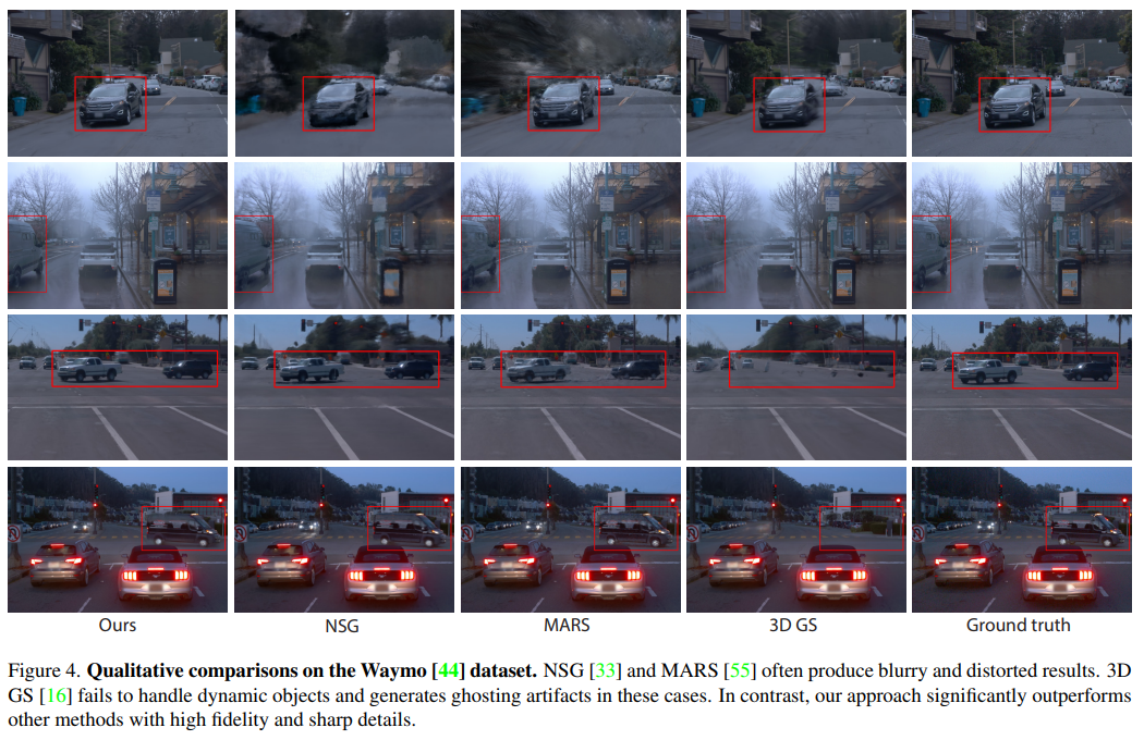 lidar point가 풍부하게 주어진 상황이다. sequence 충분히 촘촘하고 point density도 충분하다. 이 상황에서 3D bbox detector + tracker를 붙여 배경과 물체(차량)을 구분해서 GS로 복원한다. 이 때 물체는 움직이므로 time dimension까지 고려해서 4D로 구현하고 배경은 3D gs다. 복원이 완료되면 다양하게 주행 데이터셋을 찍어낼 수 있는 시뮬레이터 같이 쓸 수 있다. |