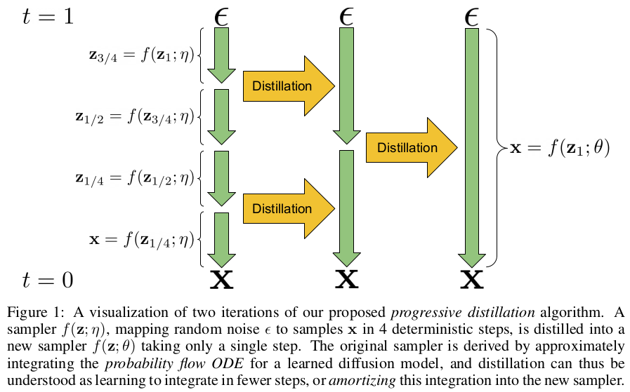 1000번 걸릴 diffusion model 500번으로 1/2씩 줄여 distillation하는 방법