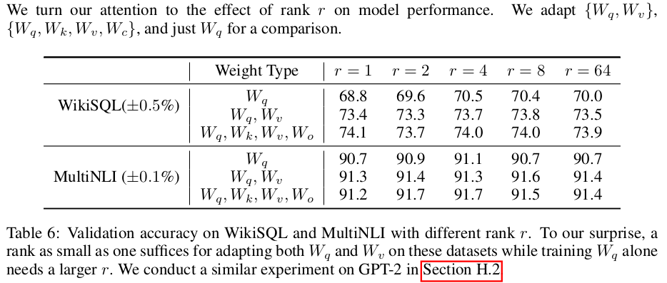 | rank, r을 적게 사용하면 tuning 능력이 줄어들고, original model dimension에 가깝게 쓸 수록 기존 full fine tuning 기능에 가까워지는 모양이 되므로, tuning 정도를 조절할 수 있는 자유도가 생기는 장점까지 있다. |