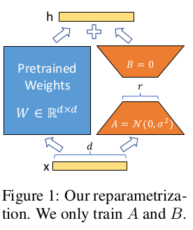 | 그래서 LoRA는 residual weight를 계산하는 컨셉을 유지하되 병렬적 구조를 취한다. 그림 1과 같이 original model block 1개 통과할 때 같은 입력을 받아 병렬적으로 residual weight를 계산한다. 더불어 residual weight도 original model weight dimension 그대로 다루면 용량 문제가 있으니 low rank decomposition을 통해 rank가 낮은 matrix 곱으로 쪼개질 수 있도록 했다. 핵심 가정은 original model weight가 이미 충분히 많은 능력을 보유하고 있을테니 fine tuning 시에는 minor한 업데이트만 필요할 것이라는 내용이다. low rank 즉 intrinsic하게 대략적으로만 업데이트 해줘도 충분히 tuning될 것이라는 이야기다. 그래서 low rank matrix로 분리했다. |
