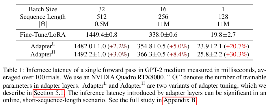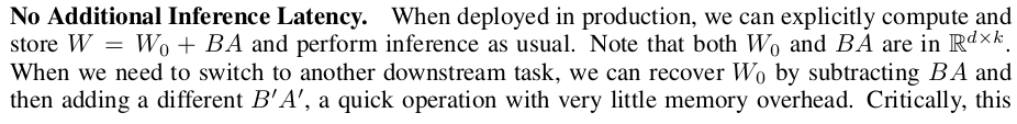 | latency 문제도 latency를 가장 크게 먹는 original model 부분이 1번만 forward되고 엄청 작은 규모의 LoRA만 병렬적으로 forward되는 형태이므로 거의 문제가 없다. |