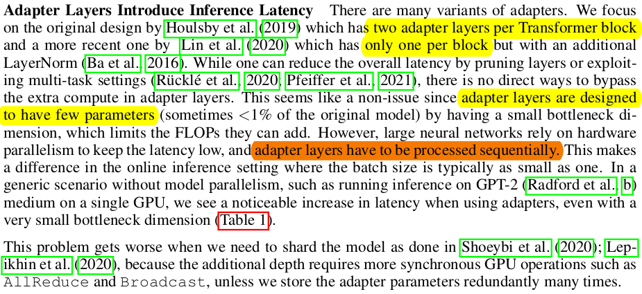 | 첫번째로 모델 중간 중간 adater layer를 끼워넣는 방식인데, 이는 컨셉 상 완전히 LoRA와 동일하다. residual weight를 얻는 방식이기 떄문이다. 하지만 구조 상 sequential하게 모델 중간에 끼워넣어져 있기 때문에 서비스할 때 병렬 처리가 불리하다. 병렬 처리가 가능하려면 original model forward 한 번 콜 되었을 때 downstream task 별로 결과를 활용할 수가 있어야 하는데, 이는 직렬적이기 때문에 구간 별로 끊기는 문제가 있다. 다시 말하면 (forward 조금 한 다음 adapter layer 별로 통과 ) 과정을 계속 반복해야 하므로 latency 문제가 있다. |