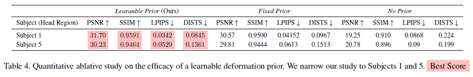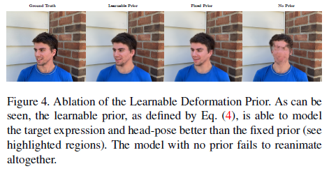 1) 촬영된 이미지 COLMAP 돌림 (사람 웬만해선 안 움직인 영상), canonical space 구성. 2) 머리 부분만 align 맞춰서 FLAME vertex 추가 3) FLAME vertex에 가까운 point들만 FLAME vertex와의 거리를 기반으로 regularization 가하면서 deformation space 구성 4) 렌더링 |