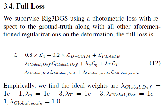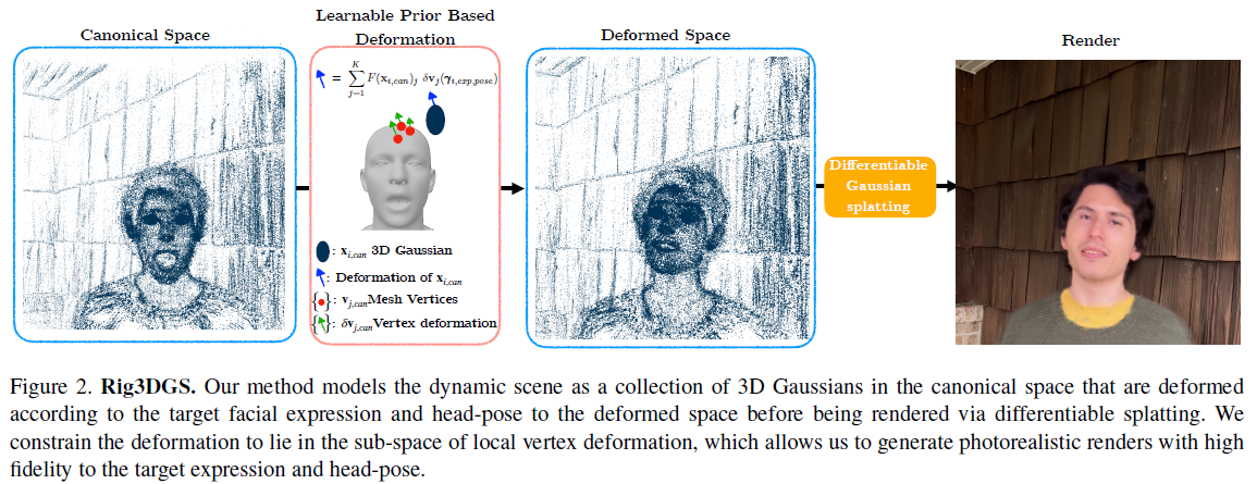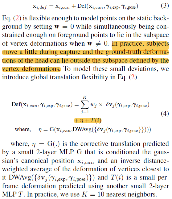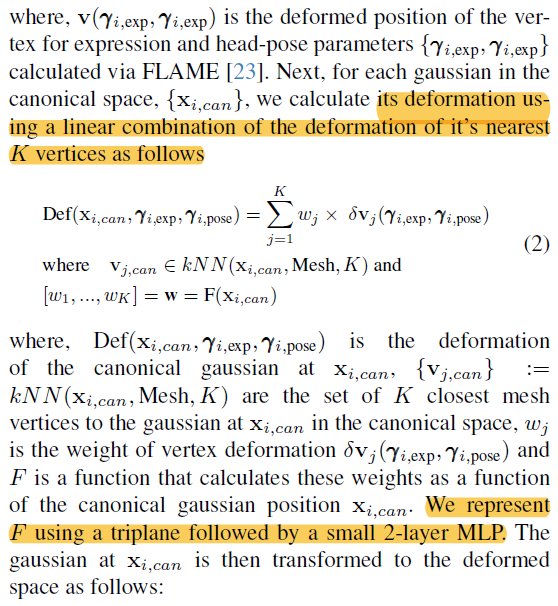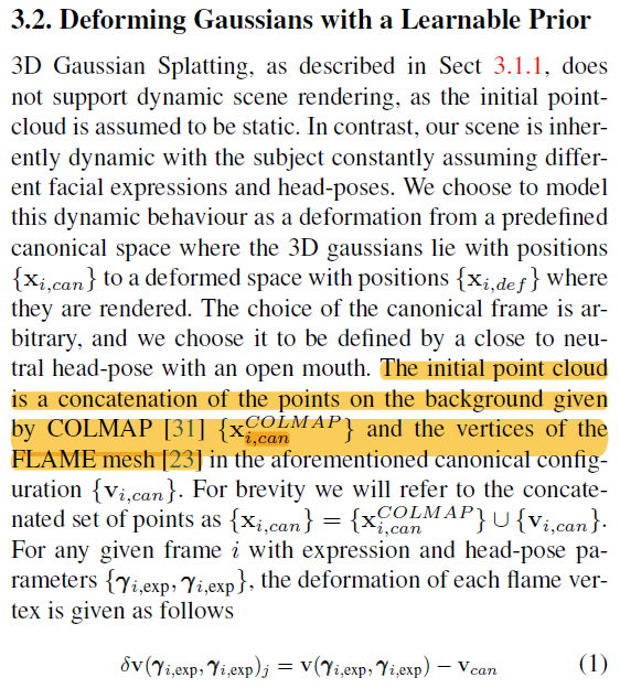 1) 초기화에 사용되는 point는 COLMAP + head align한 FLAME vertex다. (어떻게 align 했는지 안 나와있음) ---- FLAME을 prior로 사용하는 가장 쉬운 방식은 3d gs들이 flame vertex에 binding된 형태로 움직이게 하는 것이므로, nearest vertex가 이 논문의 핵심이다. ---- 모든 deformable 논문들이 그렇듯, 초기화 결과가 canonical space가 되고, 그 이외는 deformation space로 정의된다. canonical to deformation 사이의 움직임을 point 단위로 residual로 계산된다. ---- vertex의 nearest point들은 vertex 움직임에만 의존해서 weighted average로 움직인다. |