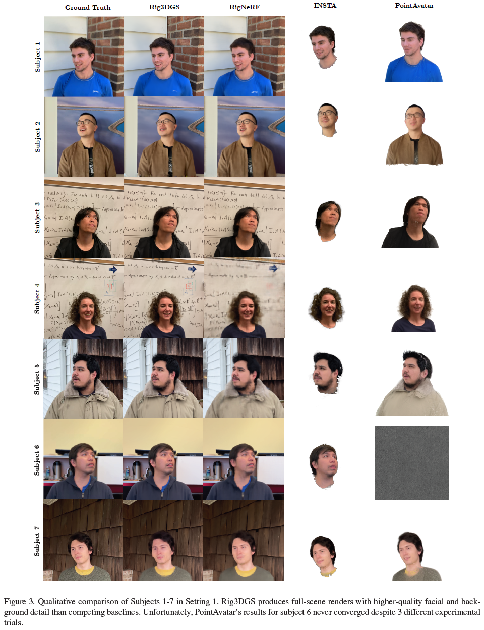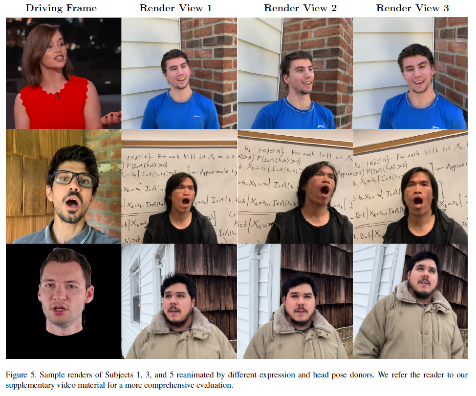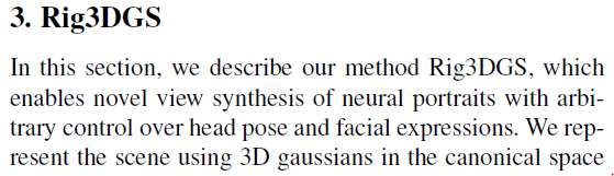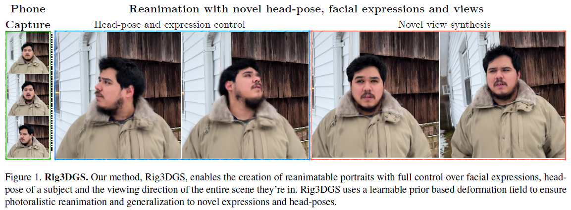 이 논문은 Adobe research 과제로 나온 논문 같은데 왠지 곧 CVPR에 나올 것 같다. 하고자 하는 것은 head mesh model +3d gaussian splatting을 합쳐서 animatable head rendering을 가능하도록 만드는 것이다. 머리를 제외한 대부분 형상(배경, 몸 등)이 고정되어 있다는 전제하에 머리를 가누거나 돌리는 이미지 렌더링을 할 수 있다.