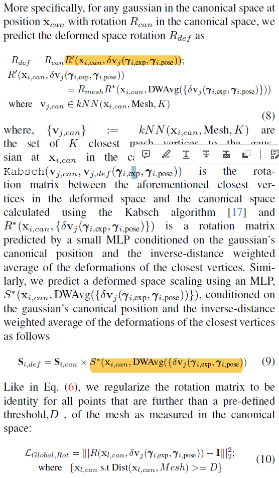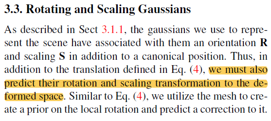deformation space가 x,y,z movement만 있으면 안되고 3D GS다 보니 rotation, scale도 당연히 있어야 한다. 이 또한 x,y,z movement 추정한것과 같은 입력으로 rotation, scale residual을 추정하는 네트워크를 붙여서 해결한다. nearest 개념도 다 똑같다. 중간 kabsh 알고리즘은 point 두 군집이 주어졌을 때 두 군집 사이의 상대 R를 계산해는 알고리즘이다. ---- rotation은 최대한 identity에 가깝게, scale은 1에 가깝게 억제한다. ( 결국 촬영할 때 웬만하면 가만히 있으란 소리 아니냐?.. ) |