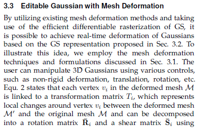 mesh deformation은 기존 control point를 이용하는 방식으로 SE3 transformation을 vertex 단위로 쉽게 얻을 수 있다. 수식(2)와 같이 계산된 SE3를 갖고 주변 neighbor vertex를 최대한 유사하게 움직이도록 최적화해주면 전체 mesh가 움직이는 모양이 된다. 여기서 얻은 SE3를 polar decompostion으로 rotation + shear로 나누면 그대로 3d gaussian rotation + scale에 적용할 matrix로 바꿀 수도 있어서 아주 손쉽게 3d gs까지 연결할 수 있다. |