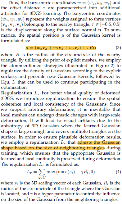 face normal에 수평한 방향으로 증식할 경우, barycenteric coordinate로 표현할 수 있으므로 수식(3)의 첫 괄호와 같이 간단히 적을 수 있고 수직하게 증식하는 경우 normal 방향 * 특정 scale로 표현할 수 있다. 참고로 R은 face를 둘러싸는 외접원의 반지름이다. 특정 scale을 찾을 때 열린 scale로 찾기보다 face 크기에 relative한 형태로 찾는 것이 찾기 쉬우니 이렇게 한 것 같다. -------- + 웬만하면 3d gaussian들이 face 크기를 넘어서지 않도록 억제한다. (불규칙하게 뾰족한 애들 생기지 않도록, 생기면 deformation했을 때 artifact 심해짐) |