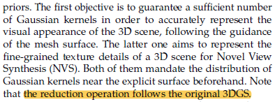 3d gs는 각 face 중심에 생성하는 식으로 초기화함. 그리고 face normal에 수평한 방향+ 수식한 방향으로만 densification될 수 있도록 했음. reduction은 원본 3dgs 그대로 특정 iteration마다 opacity 0으로 초기화하는 방식으로 커버함. |