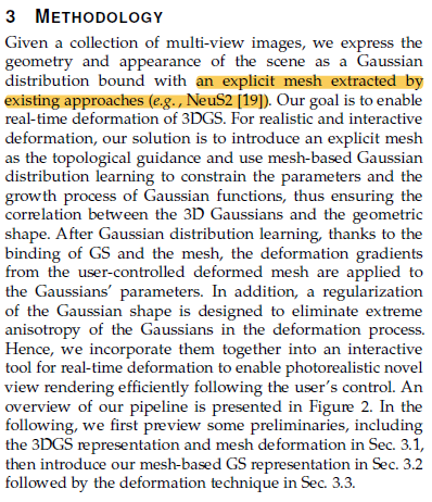 | 3d gaussian을 구속할 기준 mesh는 주어진 데이터를 활용해서 NeuS2를 돌려서 얻는다. 워낙 검증된 방법이기 때문에 효과적인 초기 mesh를 얻을 수 있을 것 같다. | 3d gs recap은 생략. |