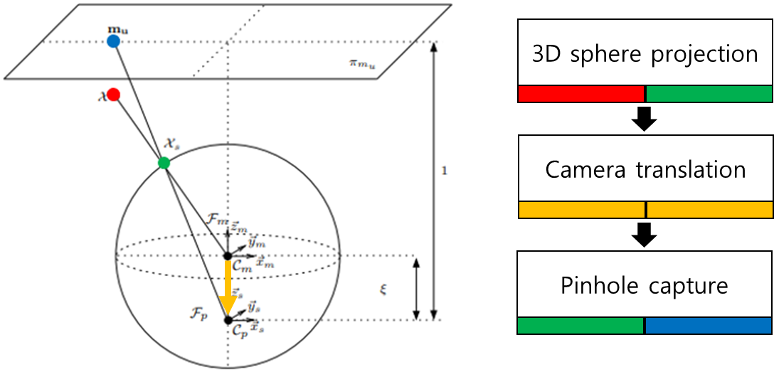 UCM은 위와 같이 설계되어 있다. 3차원 점을 구면으로 투영시킨뒤, 구 중심에 있는 카메라를 z축 방향으로 일정 xi 만큼 움직이고, 해당 위치에서 pinhole 카메라가 촬영한다고 가정하는 모델이다.