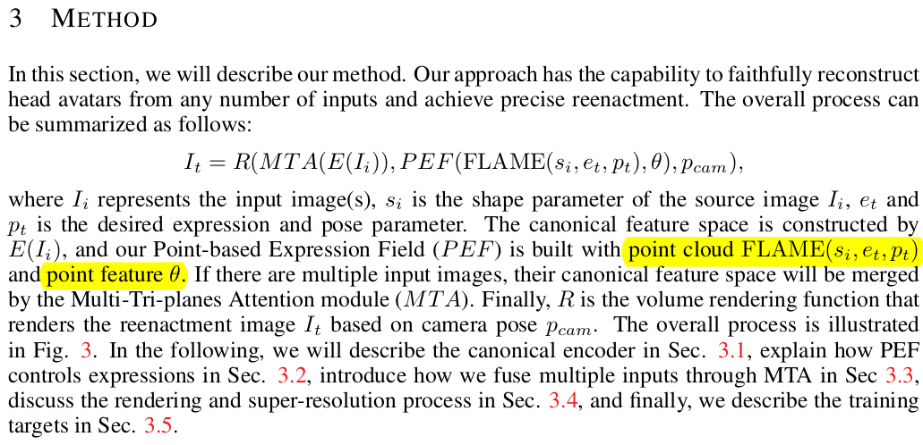 | 입력 이미지 N장은 FLAME 모델과 상관없이 별개로 multi plane representation으로 encoding 됨. 이 때 M개의 multi plane 들이 나올 수 있도록 자유도를 열어줬다. M개 마다 learanble Query가 주어져있어서 M번째는 고유한 feature space를 갖도록 설계되어있다. attention mechanism도 들어있음 FLAME feature는 vertex 마다 learnable feature가 부여되어 있다. 이는 나중에 렌더링할 때 ray sampling에 맞추어서 point feature로 사용된다. point feature + image feature로 이미지 렌더링 -> super resolution |
