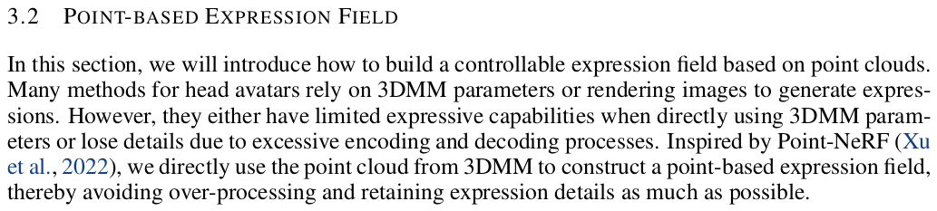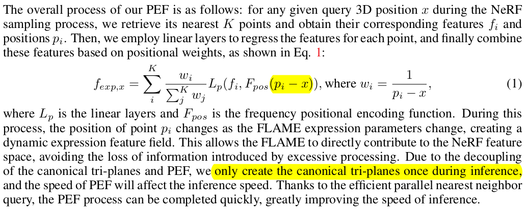 | point feature는 FLAME vertex마다 learnable feature를 부여했다. 이미지 렌더링 ray sampling 시 어떤 위치가 주어지면 nearest point feature를 가져다가 쓴다. 참고로 ray sampling 시 얼굴 주변에서만 하면 성능이 구려서 허공도 그냥 샘플링했다고 한다. head pose를 최대한 여기서도 고려하지 않도록 하기 위해 camera 좌표계로 사용. |