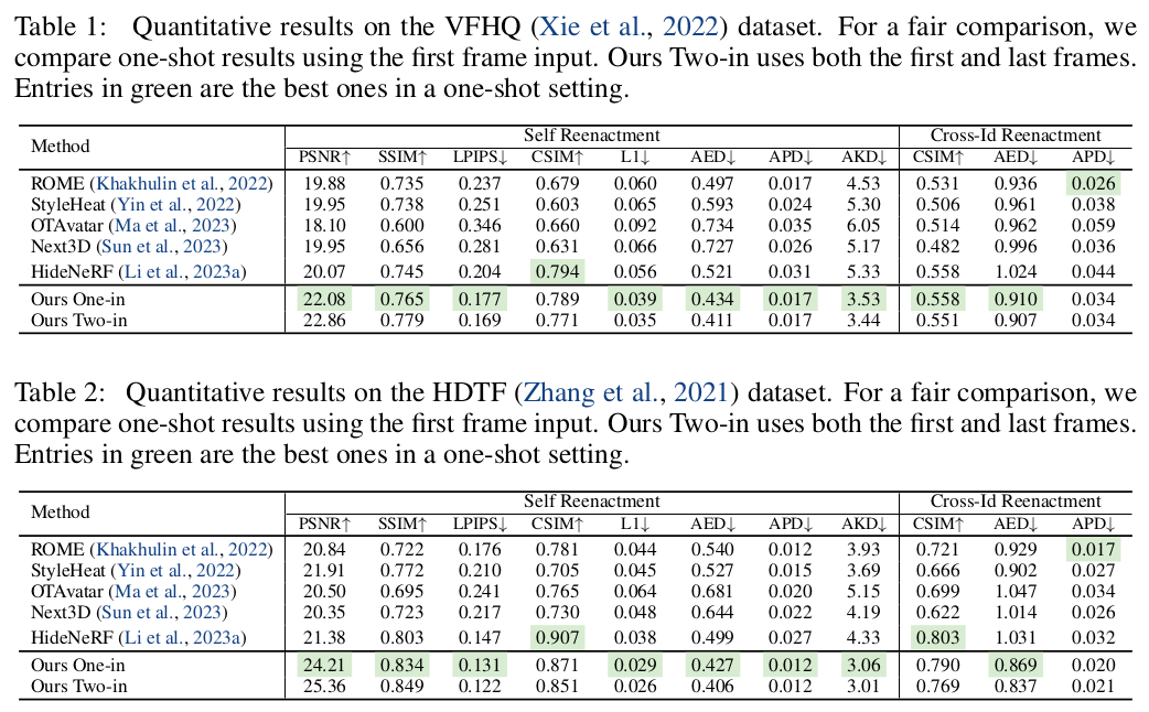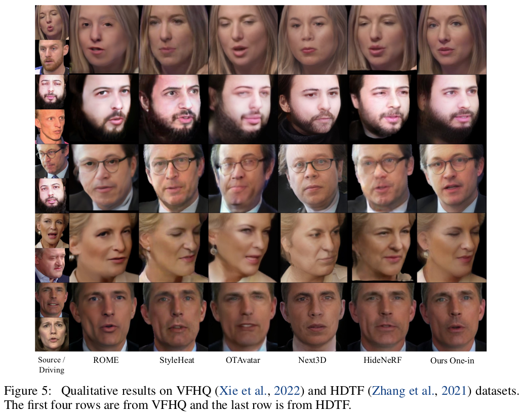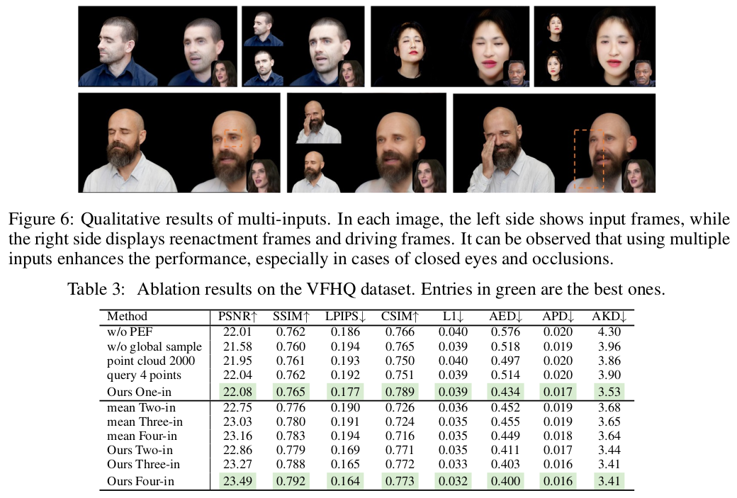 핵심 아이디어는 이미지 feature와 FLAME feature를 분리해서 inference할 때 FLAME feature만 바꿔가면서 표정 변화를 할 수 있도록 했다는 점이다. 3D consistency를 유지하기 위해서 NeRF 컨셉을 넣기도 했는데 이건 거의 유행처럼 번진 수준 같다.