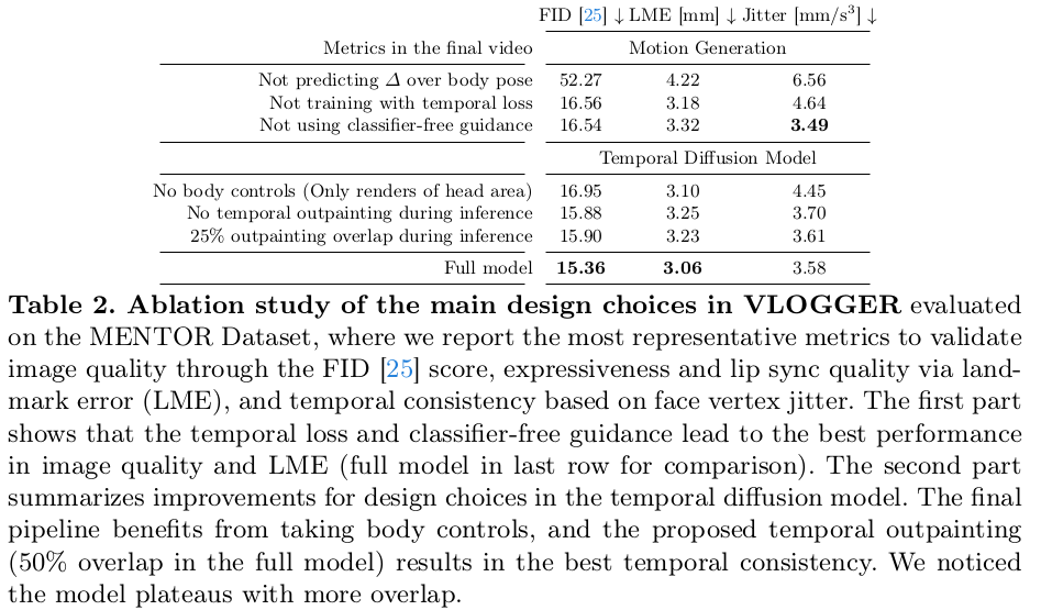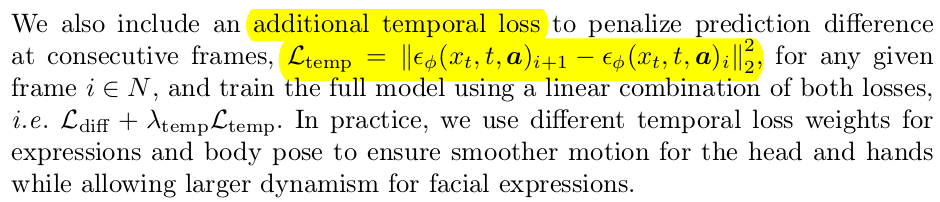 | 학습은 end-to-end기 때문에 뒤에 붙은 diffusion 모델에서 loss를 가져와 준다. 독특한 것은 frame 간에 diffusion step 마다 업데이트 되는 noise 비슷하도록 억제해서 consistency가 유지되도록 도왔다. |